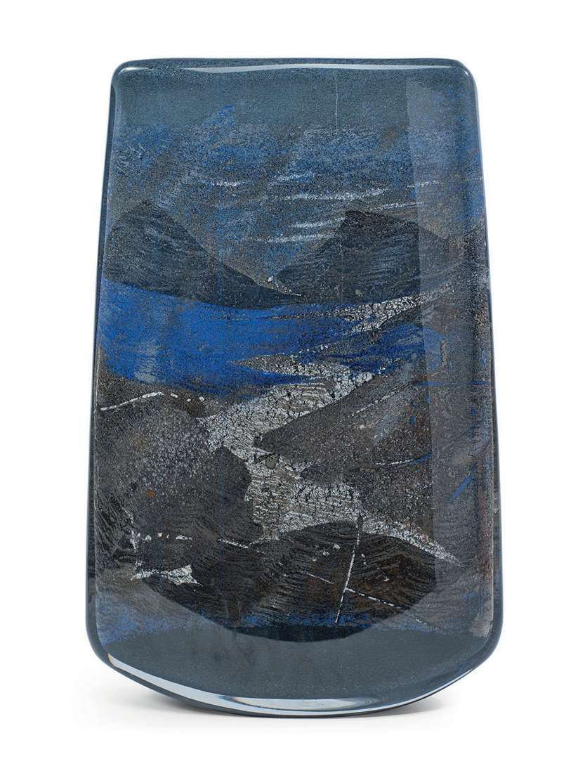 En verre soufflé, de forme rectangulaire aplatie, à décor d'un paysage, tons gris, noirs et bleus.