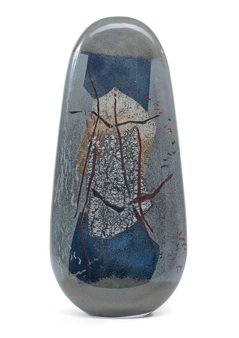 En verre soufflé, de forme ovalisée aplatie, à décor abstrait bleu, or, rouge et gris.