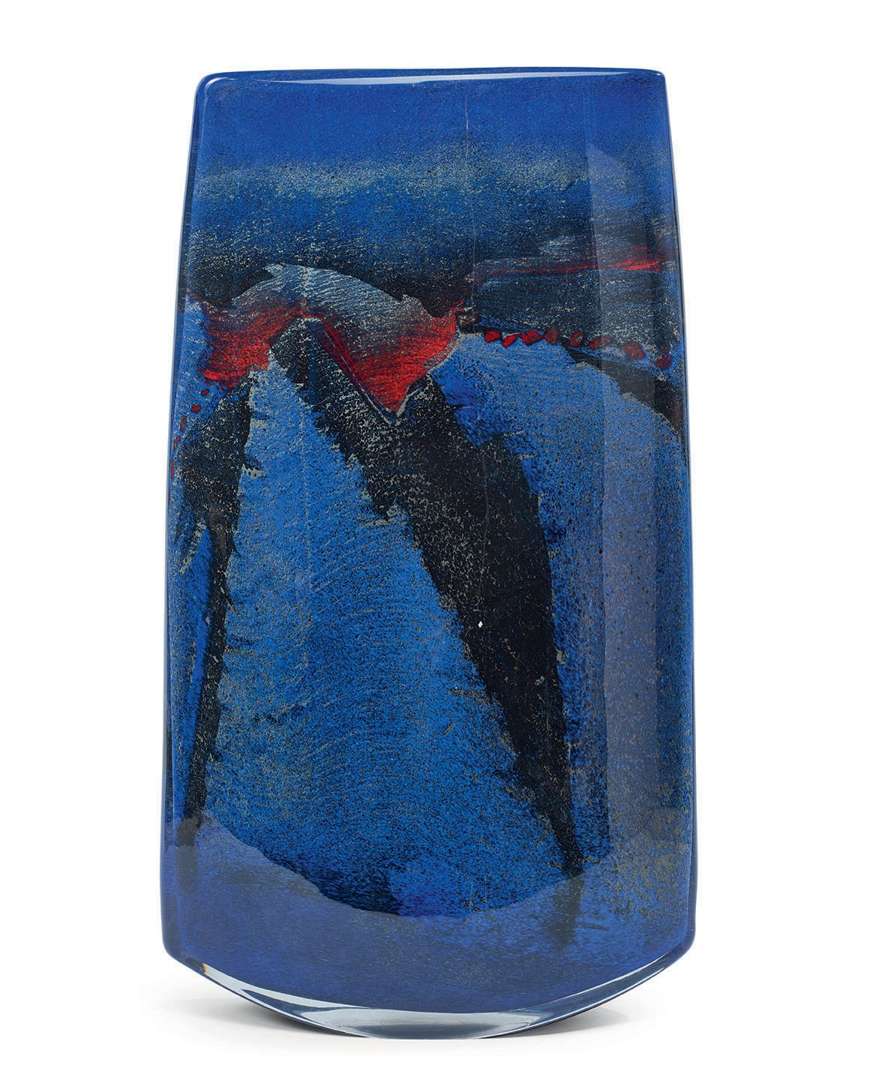 En verre soufflé, de forme rectangulaire aplatie, à décor abstrait bleu, noir et rouge.