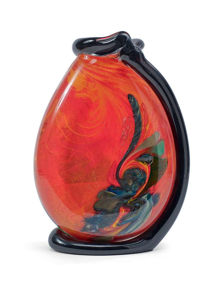 En verre soufflé polychrome, à décor abstrait bleu et brun sur fond rouge.