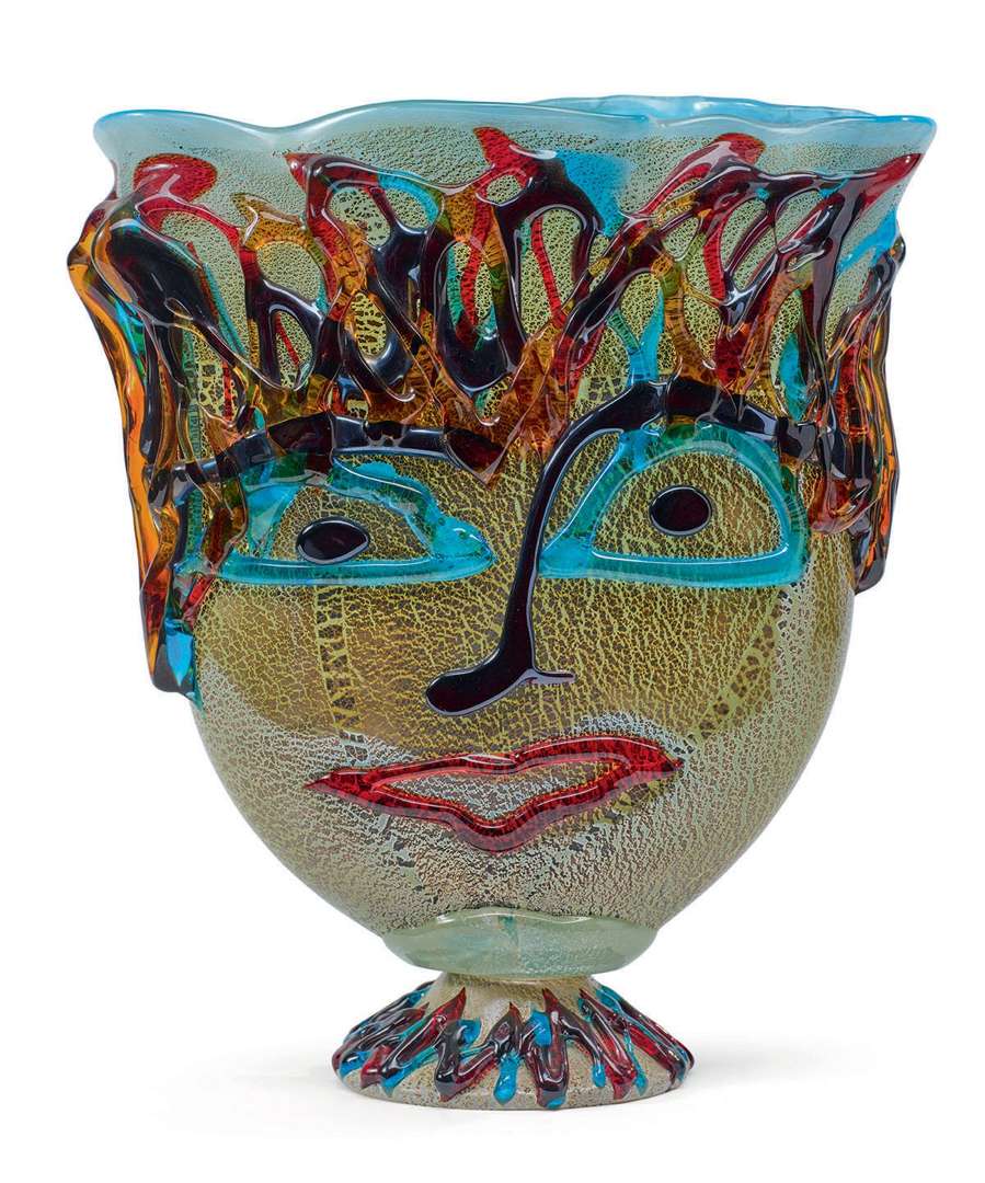 Vase en verre de Murano, figurant un visage de femme, inclusions de paillons dorés, éléments en verre polychrome appliqués à chaud.