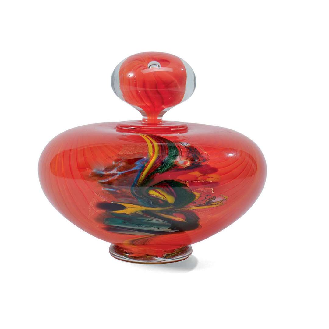 En forme de sphère aplatie, en verre soufflé polychrome, à décor abstrait sur fond rouge.
