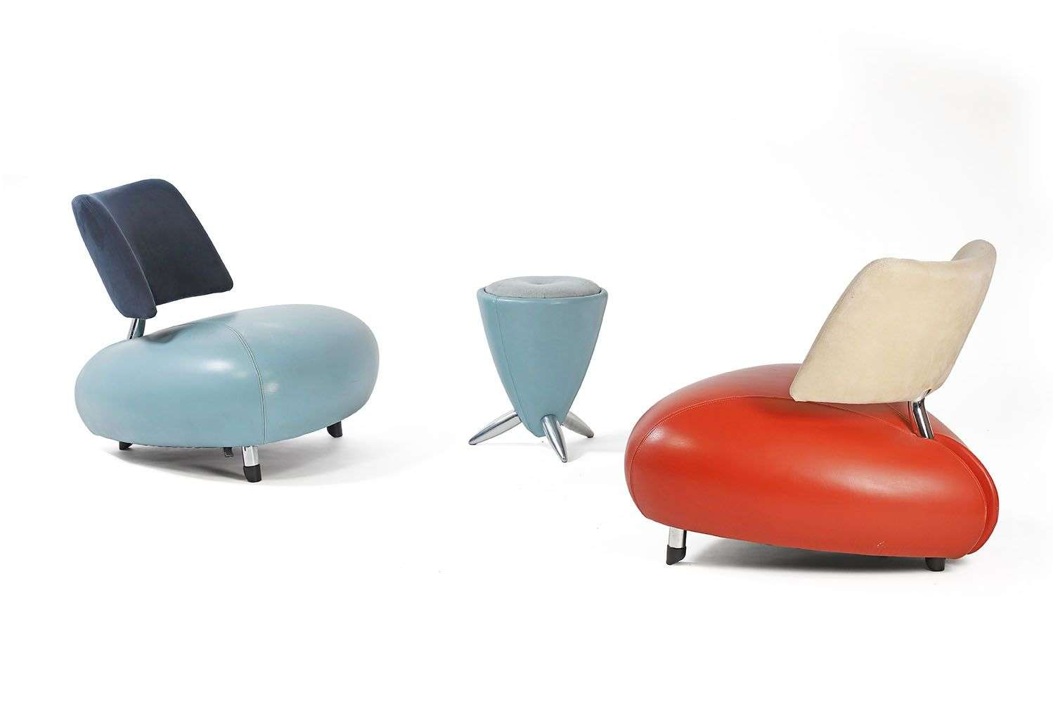 Structure garnie de mousse, l'assise recouverte de cuir bleu ciel pour l'un et rouge pour l'autre, le dossier recouvert de velours bleu nuit pour l'un et beige pour l'autre, piètement tripode en métal chromé, sabots en caoutchouc.