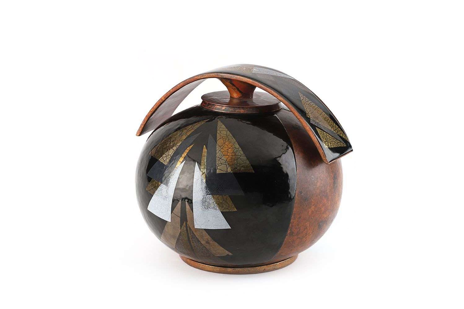 En dinanderie de cuivre martelé, à décor emaillé noir gris et or de motifs géométriques.