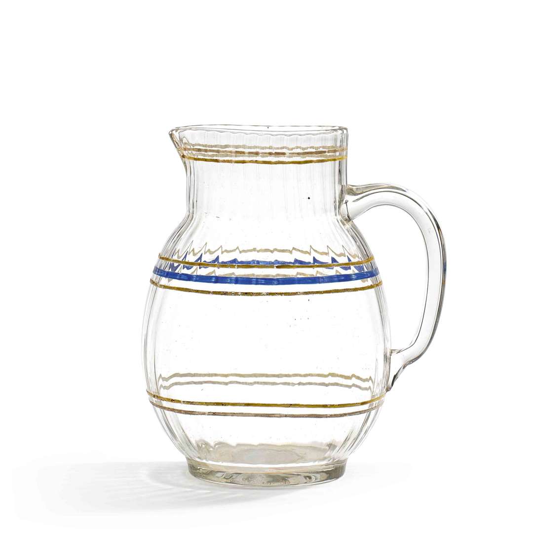 A pitcher, translucent glass with enamelled decoration. Signed.