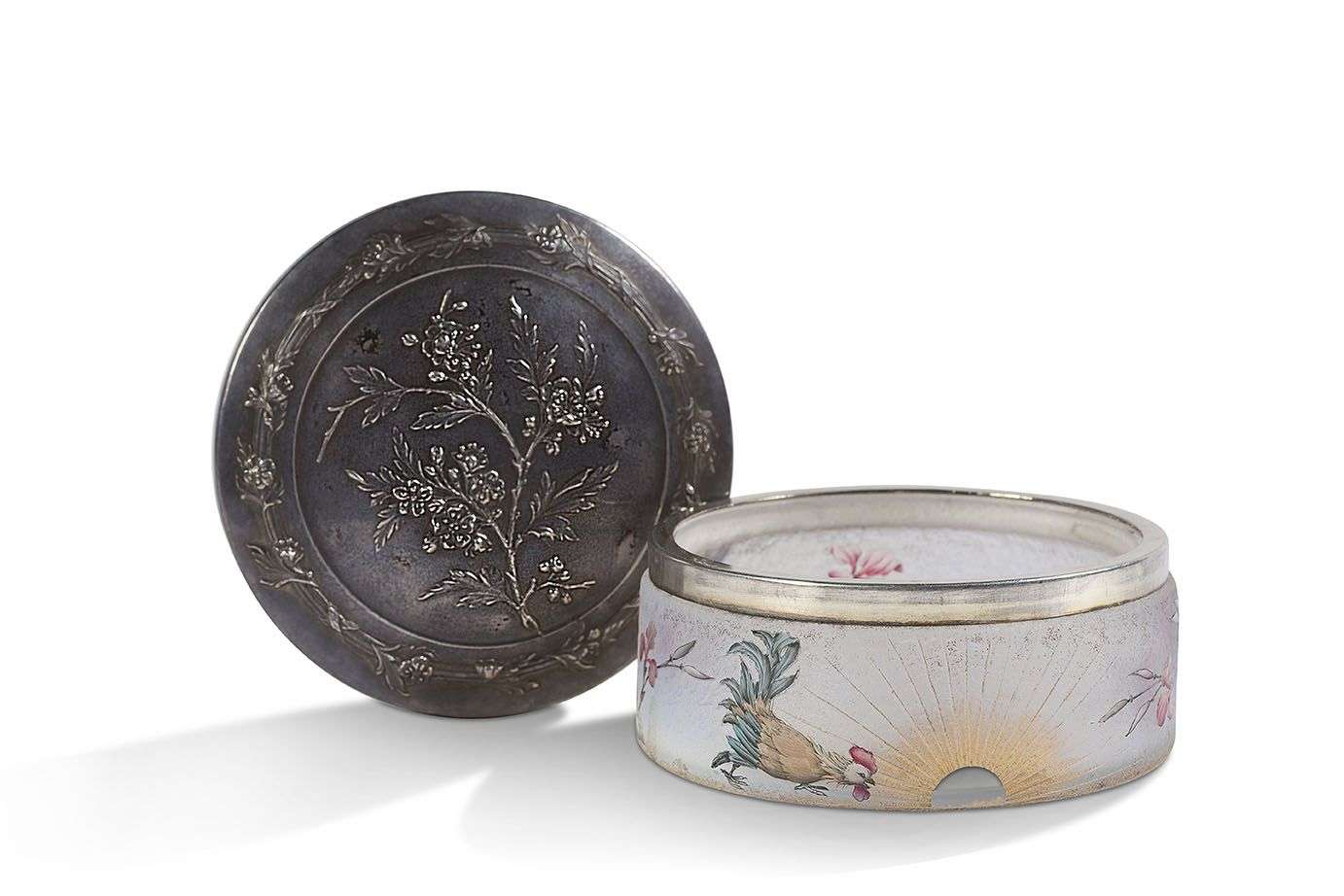 En verre multicouche givré, à décor gravé à l'acide et émaillé d'un coq au soleil levant parmi les fleurs, couvercle en vermeil à décor floral.