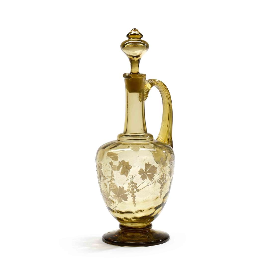 La prise cannelée, la panse facettée, en verre teinté jaune, à décor émaillé blanc de feuilles et pampres de vigne.