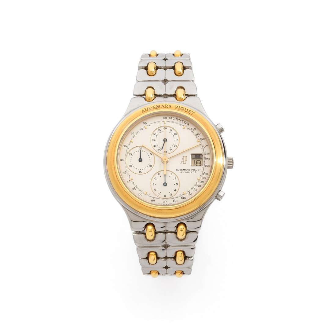 A stainless steel and 18k yellow gold automatic chronograph wristwatch with integrated stainless steel and gold bracelet