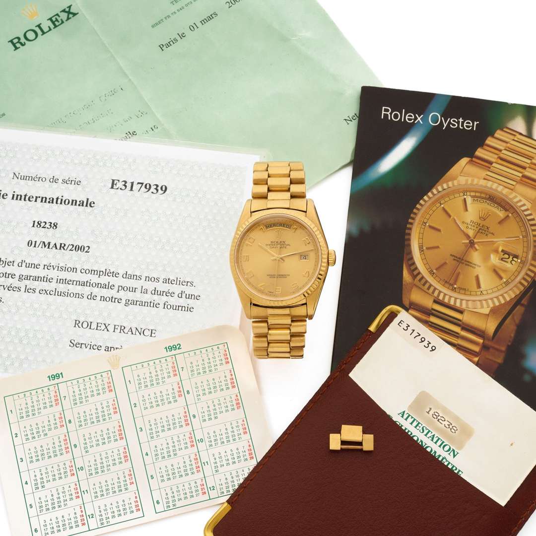 Avec : une pochette de service verte de la maison Rolex, un certificat de garantie en date 11 juillet 1991, tampon de la Relojeria Alleman Palma de Mallorca, un maillon supplémentaire, un porte document marron siglé de la couronne, un calendrier Rolex 1991-1992, un livret Rolex Oyster, un livret Your Rolex Oyster, une carte de garantie de service en date du 1er mars 2002, une facture avec le détail de la réparation