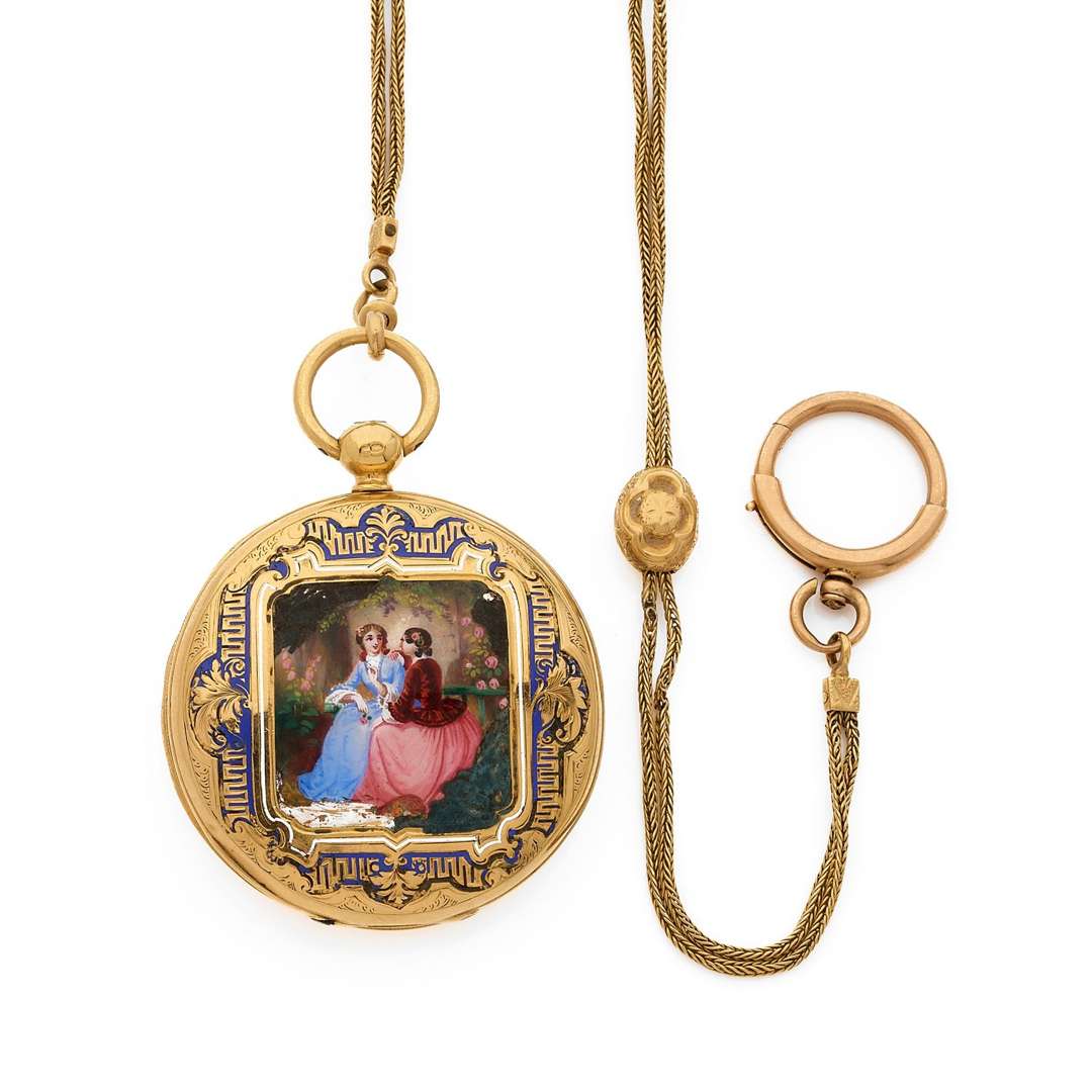 A 18k gold and enamel hunting cased key winding pocket watch with a gold chain