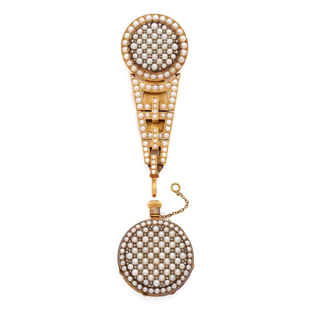 A 18k gold lady's pendant watch decorated with pearls and accompanied by a chatelaine set with pearls