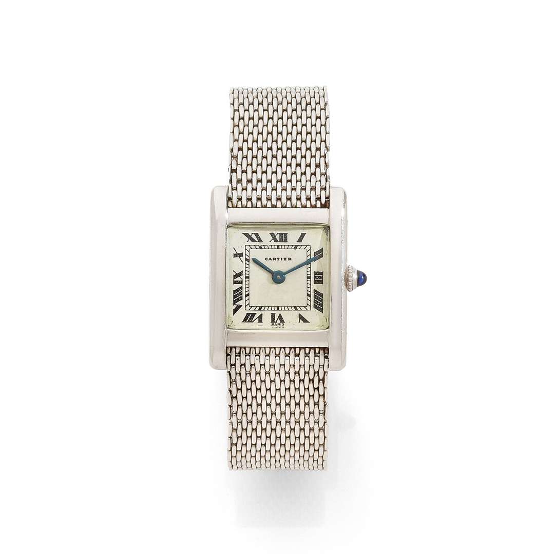 Cette montre "Tank Normale" des années 1930, similaire à celle vendue par Aguttes le 12 décembre 2023, a probablement été révisée par Cartier après-guerre, ce qui explique les pièces remplacées (cadran, mouvement) typiques des années 1950 et décrites comme « de service ». Son bracelet à mailles, décrit comme « tissu Figaro » dans le livre Cartier La Montre Tank de Franco Cologni, figure dans une image d'archives de 1926.