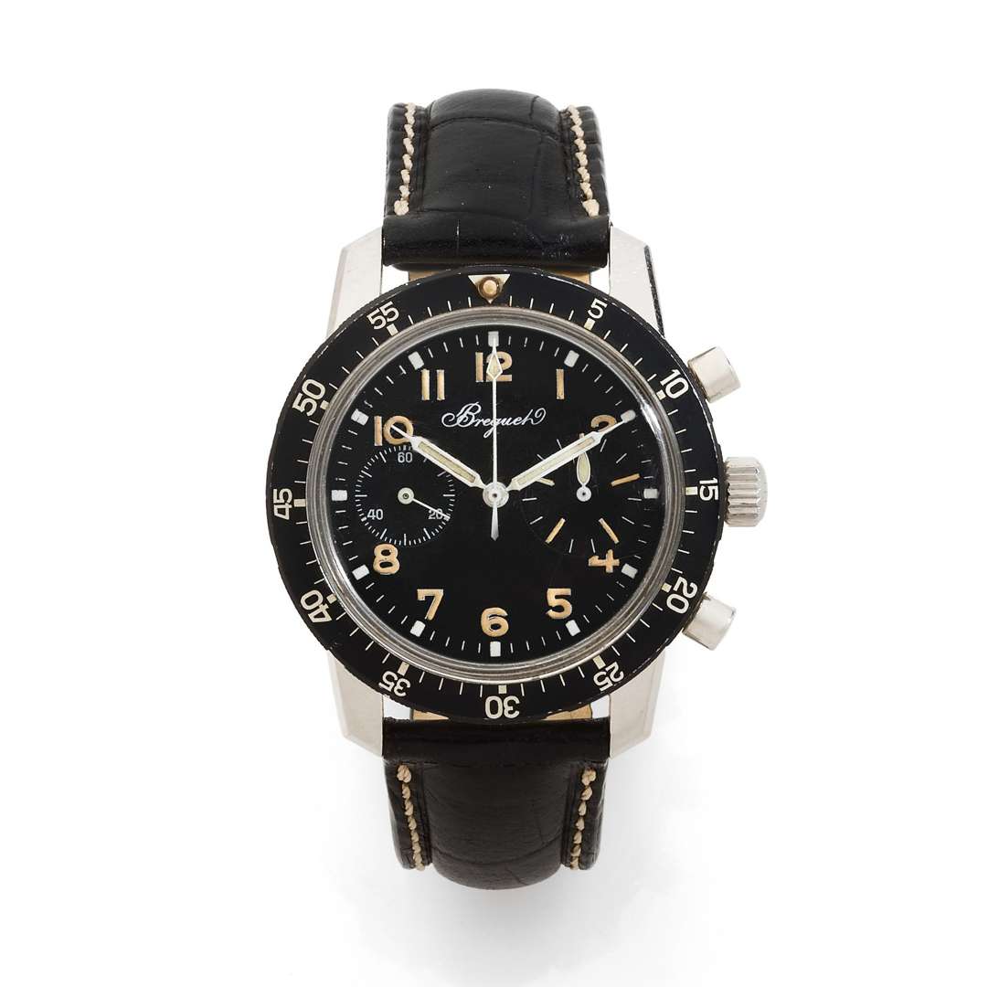 Cadran : noir avec patiné homogène des index chiffres arabes, deux compteurs pour l'indication des secondes et des minutes, minuterie externe, aiguille centrale avec fonction retour en vol, signé
