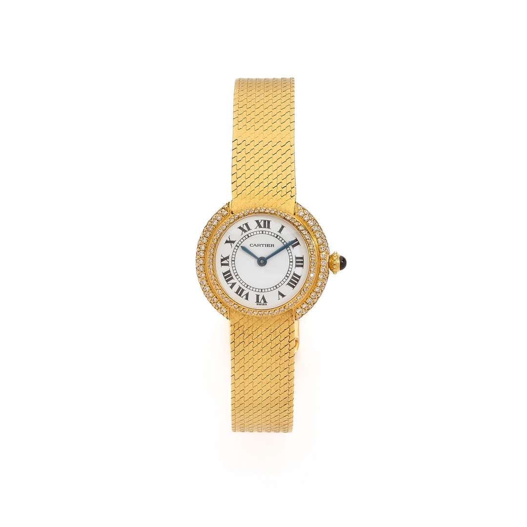 Boîtier : rond, fond fermeture à pression, lunette double rebord sertie de diamants, signé