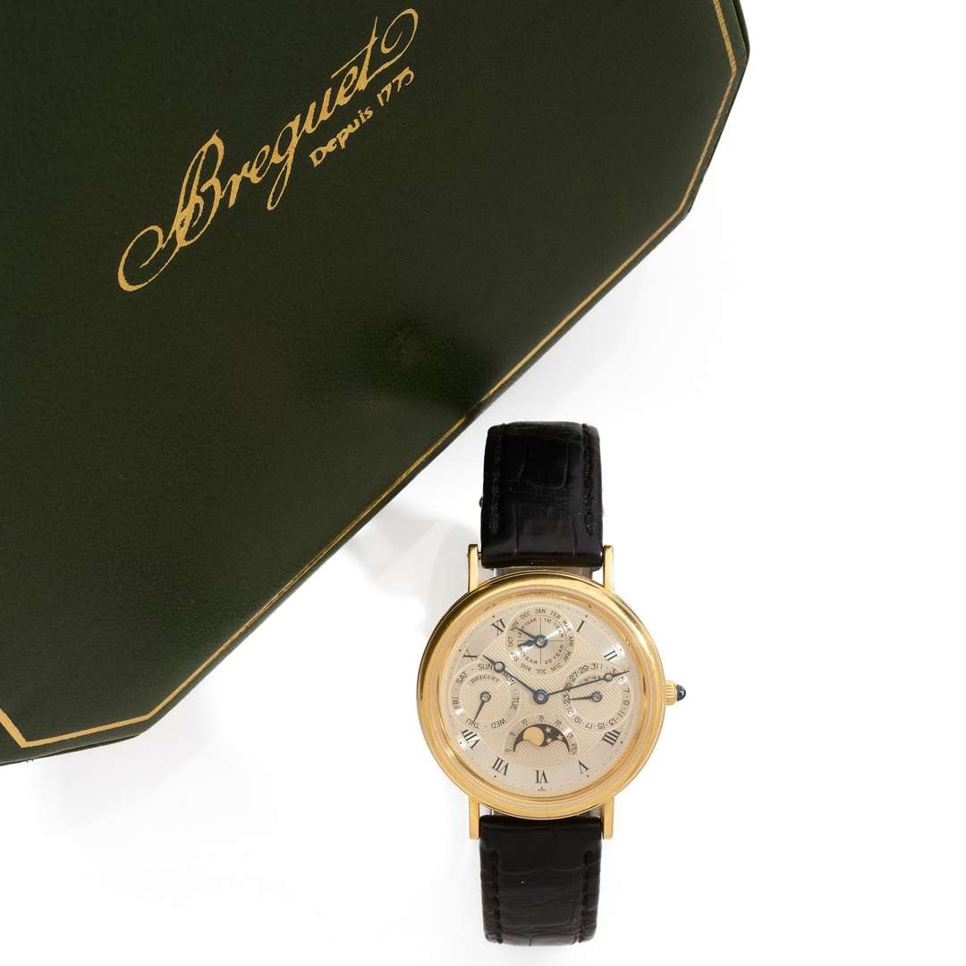 A 18k yellow gold automatic wristwatch with perpetual calendar and moon phases, gold buckle