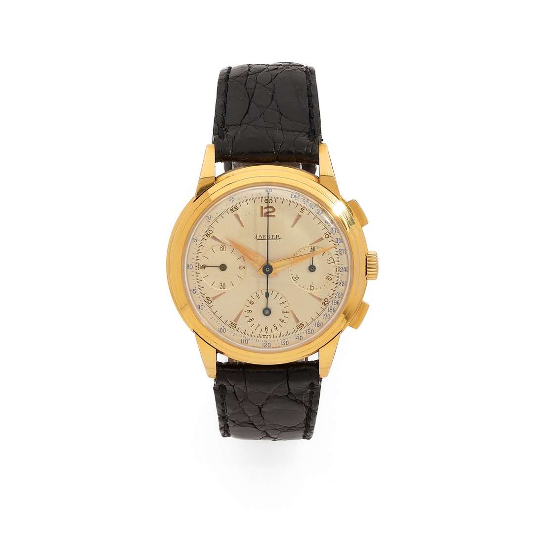 A 18k yellow gold manual winding chronograph wristwatch with tachometer scale, presentation box signed