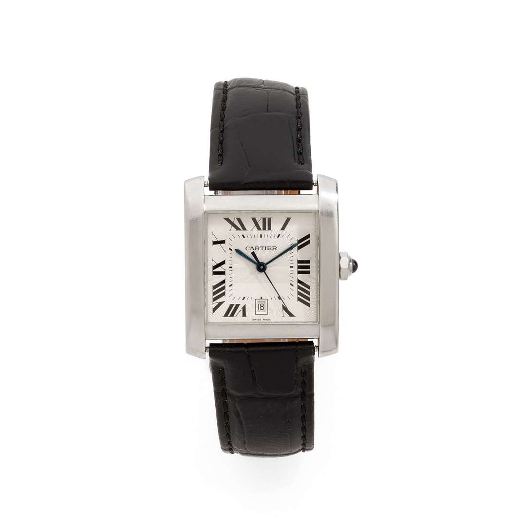 Cadran : argenté et guilloché avec trotteuse centrale, minuterie au centre, date à guichet, signé