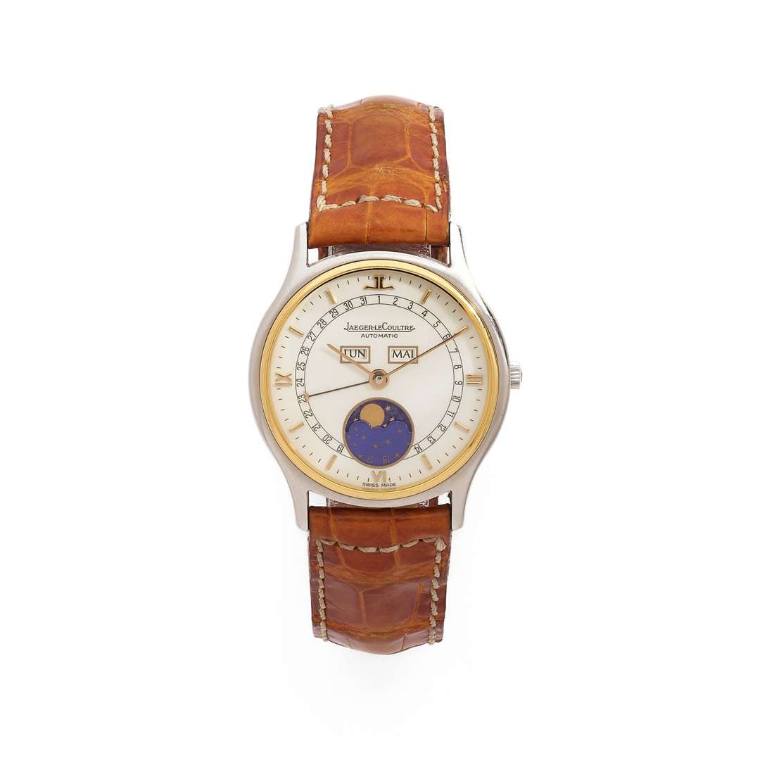 A stainless steel and gold automatic wristwatch with triple calendar and moon phases, stainless steel buckle signed