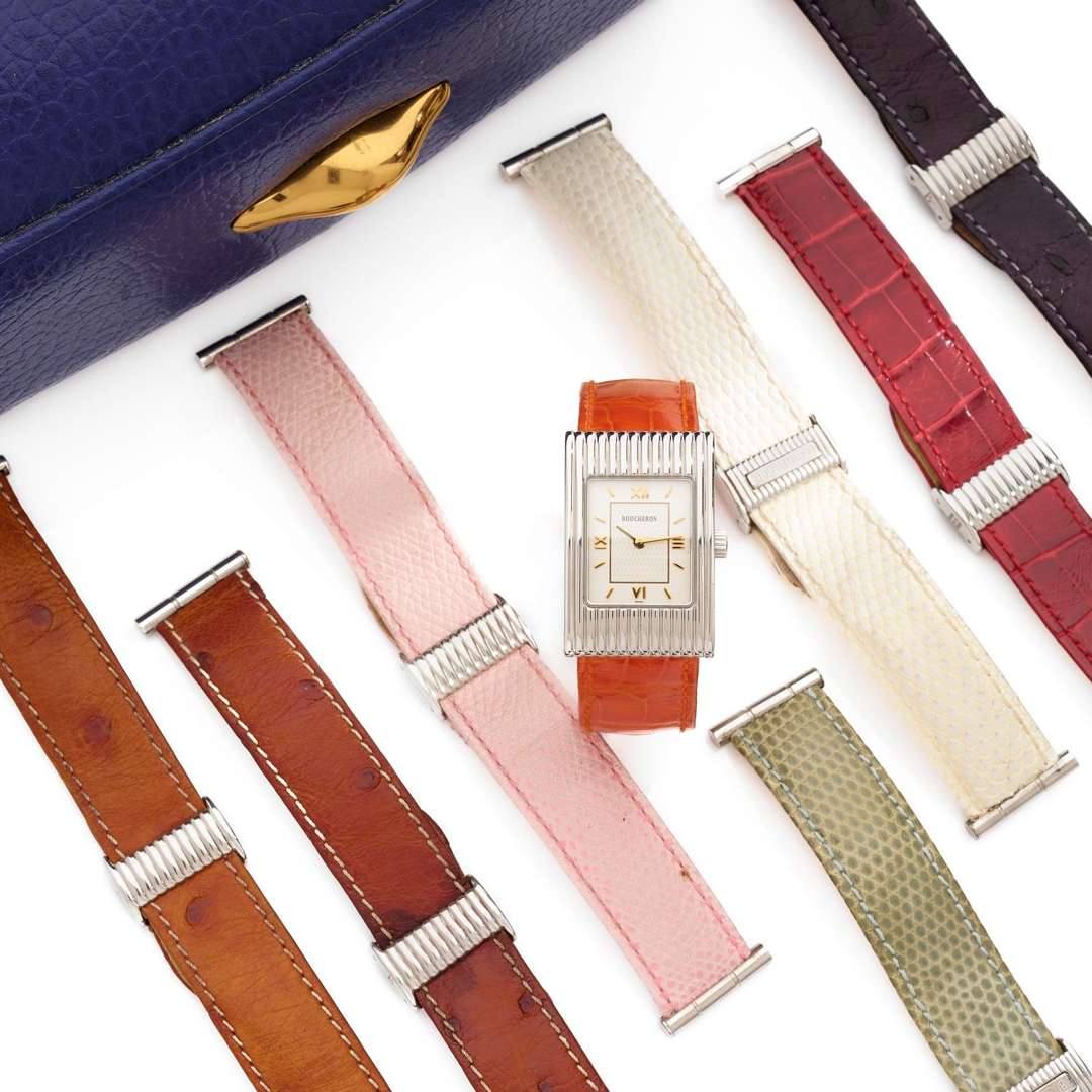 Avec : un ensemble de 7 bracelets de coloris différents avec attaches coulissantes, un duplicata facture pour le changement de la pile le 14.12.2023, un écrin et une sur boîte de la maison Boucheron.