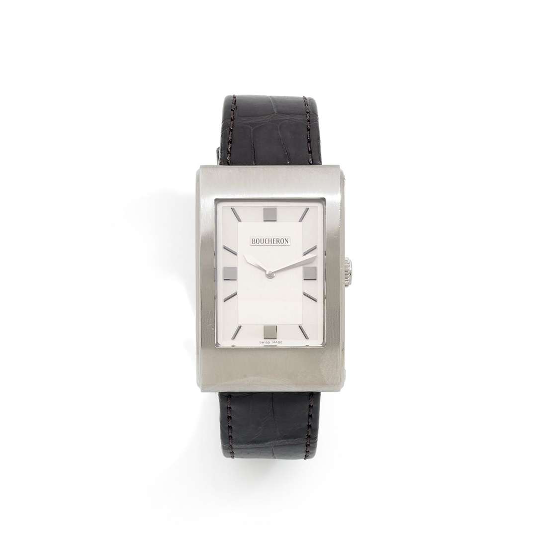 A stainless-steel quartz wristwatch, buckle signed. With a travel pouch by Boucheron