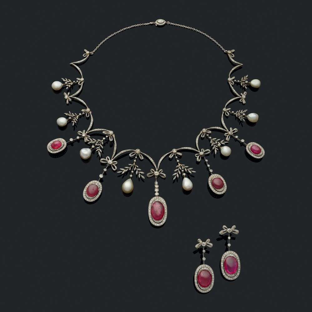 Ruby, natural pearl, diamond, platinum and gold necklace and earrings, circa 1900, report