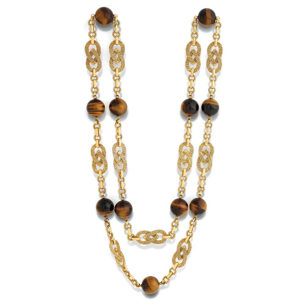 A tiger's eye and gold long necklace, stamped Georges Lenfant