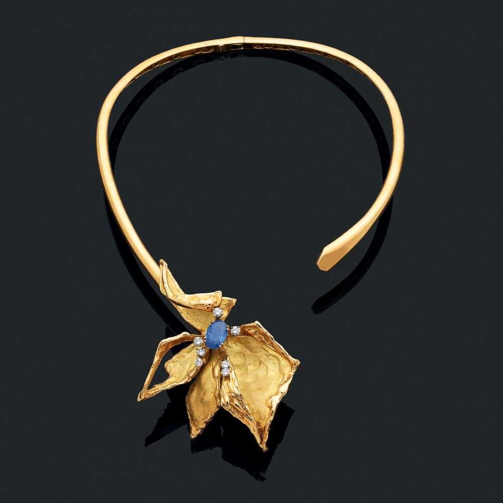 A sapphire, diamond and gold necklace (can be wear as a clip), circa 1970, signed Chaumet