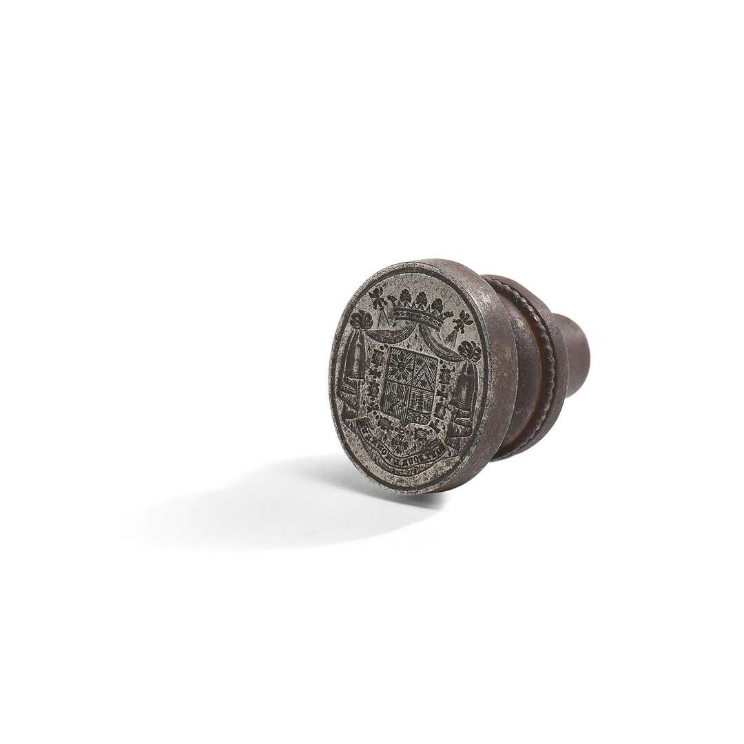 Matrice de sceau en fer forgé, le champ ovale gravé de grandes armoiries sous un manteau de duc et pair, l'écu « écartelé au 1 de pourpre au chevron d'or, accompagné de trois roses d'argent, au 2 de sinople au soleil d'or, au 3 d'azur à la fontaine (?) et au 4 de gueules au coq d'argent tenant une épée du même ». Sous une couronne ducale avec manteau de pair de France | grand collier d'un ordre non identifié : phylactère avec devise « Tout pour l'honneur ».
