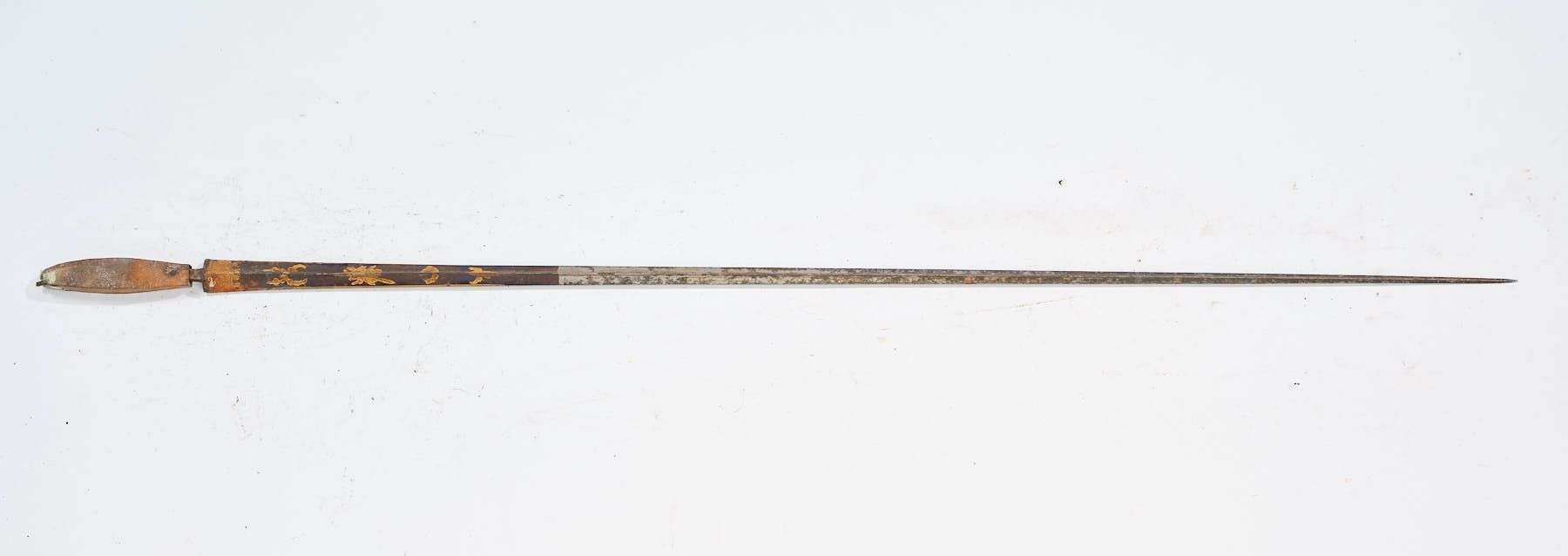 LAME D'ÉPÉE À section triangulaire, gravée, dorée et bleuie au tiers. Rest