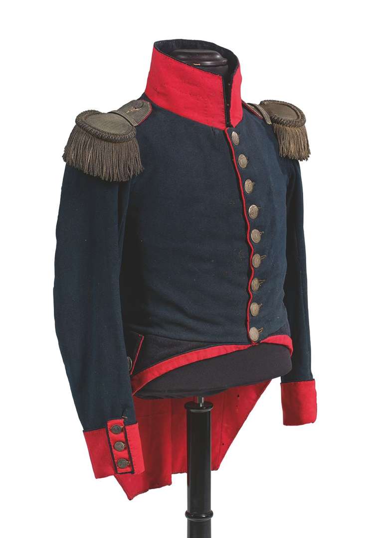 Devant à huit boutonnières et boutons gros module. Col en drap écarlate fermant à trois agrafes. Brides d'épaulettes en passementerie argent. Basques courtes, probablement un re-taillage vers 1812.
