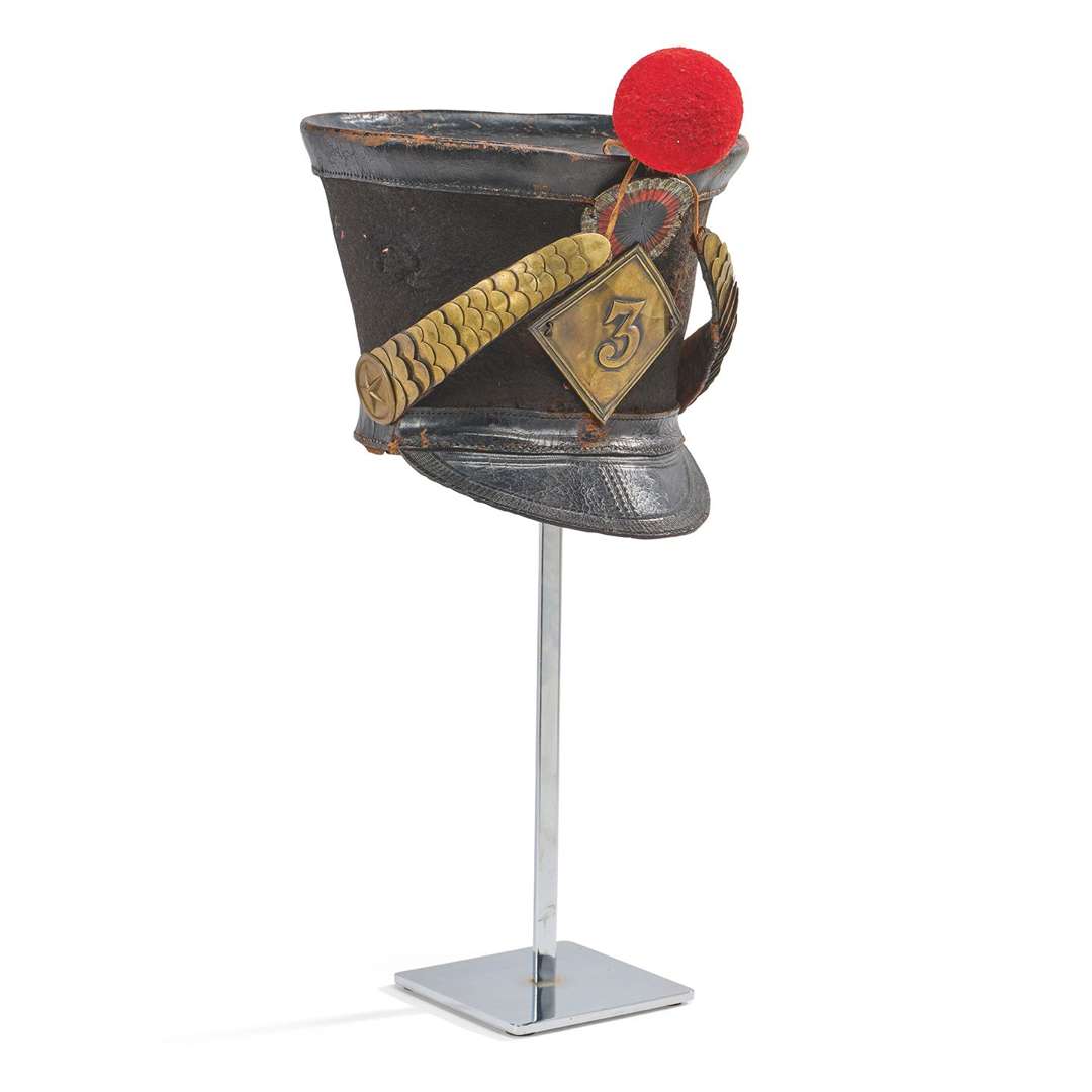 Plaque en laiton estampé modèle 1810 au chiffre 3. Fût en feutre, calotte en cuir estampé dans la doublure « CZ », couronne de lauriers et tampon à l'aigle à l'encre rouge.
