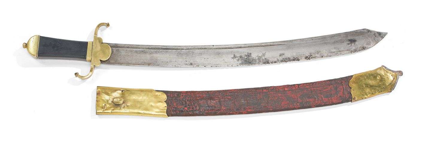 SABRE DE MARINE DIRECTOIRE Monture en bronze et ébène. Calotte de forme rectangulaire, Garde à deux quillons inversés et croisière en festons. Fusée en ébène à pans. Forte lame courbe à gouttière type cimeterre. Fourreau en cuir à deux garnitures laiton et dard en fer, inscription « LT, Laguarde » sur la chape.