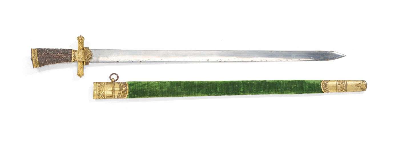 Fourreau en bois, recouvert de velours vert et deux garnitures en laiton doré et ciselé. Logement pour le batardeau audessus du bouton en forme de pomme de pin. Intérieur de la chape marquée « Manceaux à Paris ».