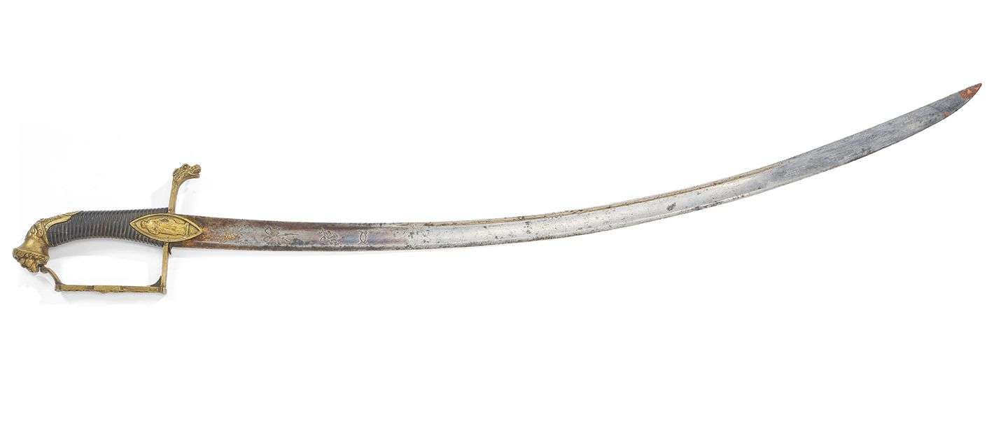 Calotte en forme de crosse à tête de lion, palmette et écailles. Arc de jointure plat à angle droit au profil d'un personnage à l'antique, croisière à décor d'une divinité antique. Quillon zoomorphe. Fusée en ébène rudenté, fêle. Lame de Solingen courbe ciselée, dorée et bleuie au tiers (restes).