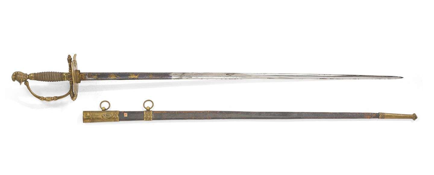 ÉPÉE D'OFFICIER DE MARINE MODÈLE PRAIRIAL AN XII Monture en laiton doré.
