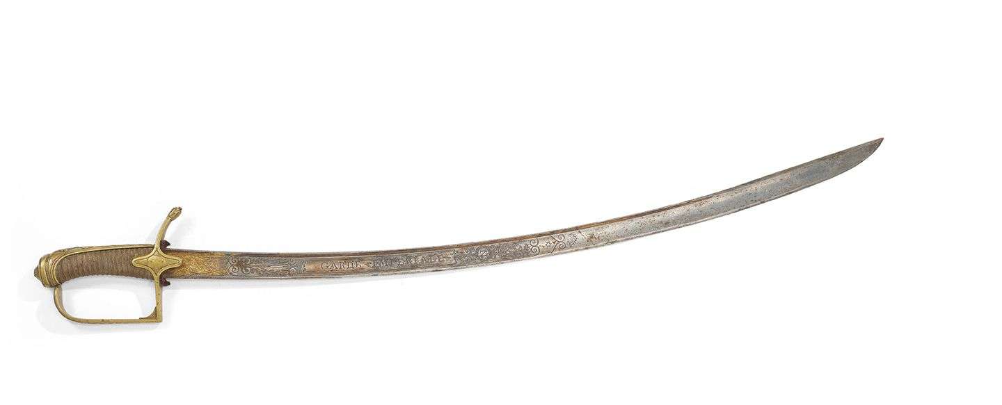 SABRE D'OFFICIER DES TROUPES À PIED DE LA GARDE IMPÉRIALE Monture en laiton ciselé à décor de feuilles d'acanthe. Calotte à longue queue, arc de jointure reliant la croisière dont demeure la trace du profil de l'Empereur et les deux trous de fixation. Quillon courbe à bouton. Fusée en bois recouverte d'un double filigrane alterné en cuivre.