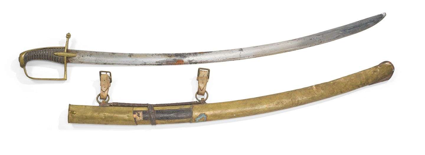 SABRE DE HUSSARD MODÈLE TROUPE TYPE AN IV Monture en laiton. Calotte ovale à longue queue, arc de jointure plat à angle droit, quillon légèrement courbé et croisière en amande. Fusée en bois recouverte de cuir filigrané laiton. Lame courbe à pans creux et contre-tranchant.