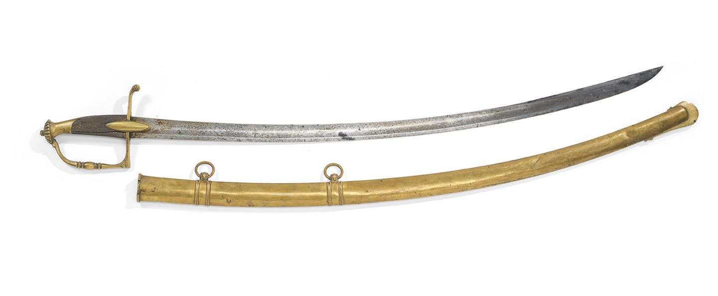 SABRE D'OFFICIER DE CAVALERIE LÉGÈRE Monture en laiton et ébène. Calotte à cote de melon puis à pans. Arc de jointure à boule, croisière en forme d'ellipse et quillon en bouton. Fusée en ébène quadrillé (fel). Lame de Solingen courbe à pans creux gravée au tiers (restes de dorures).