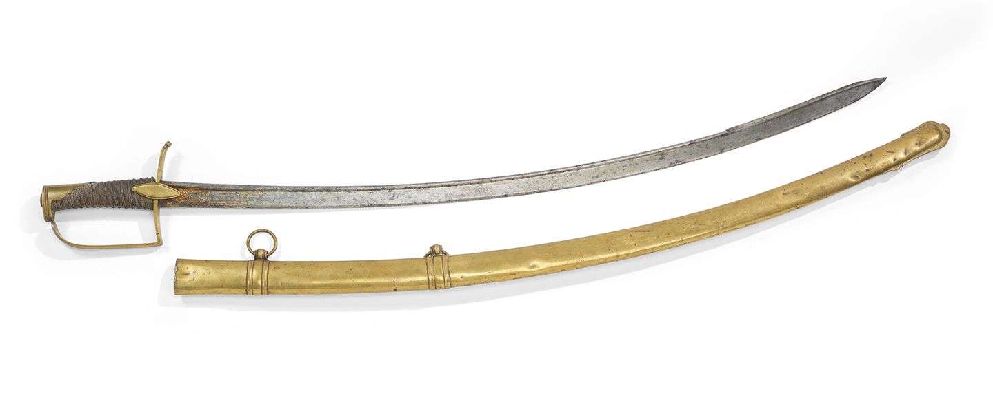 SABRE D'OFFICIER DE LA CAVALERIE LÉGÈRE Monture à l'allemande en laiton. Calotte à plateau reliant l'arc de jointure décoré aux traits.