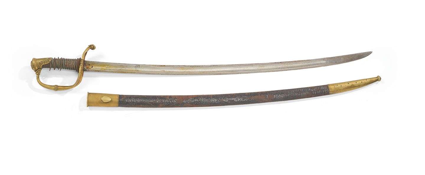 Fusée en bois couverte de cuir filigrané (accident). Lame courbe à pans creux et gouttière gravée au dos de la manufacture de Klingenthal et datée 1822.