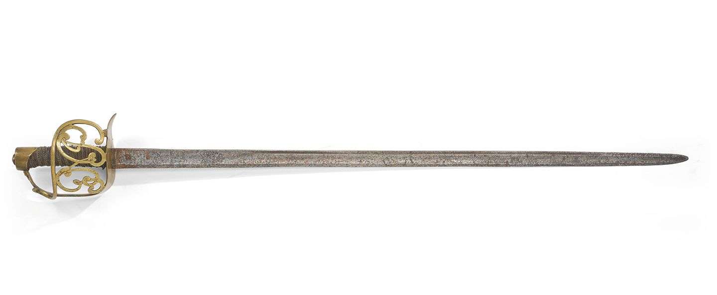 Lame par Gouland fourbisseur à Paris, droite à pans creux et gouttière gravée « CAVALERIE NATIONALE » sous les armes de France (oxydations). Sans fourreau.