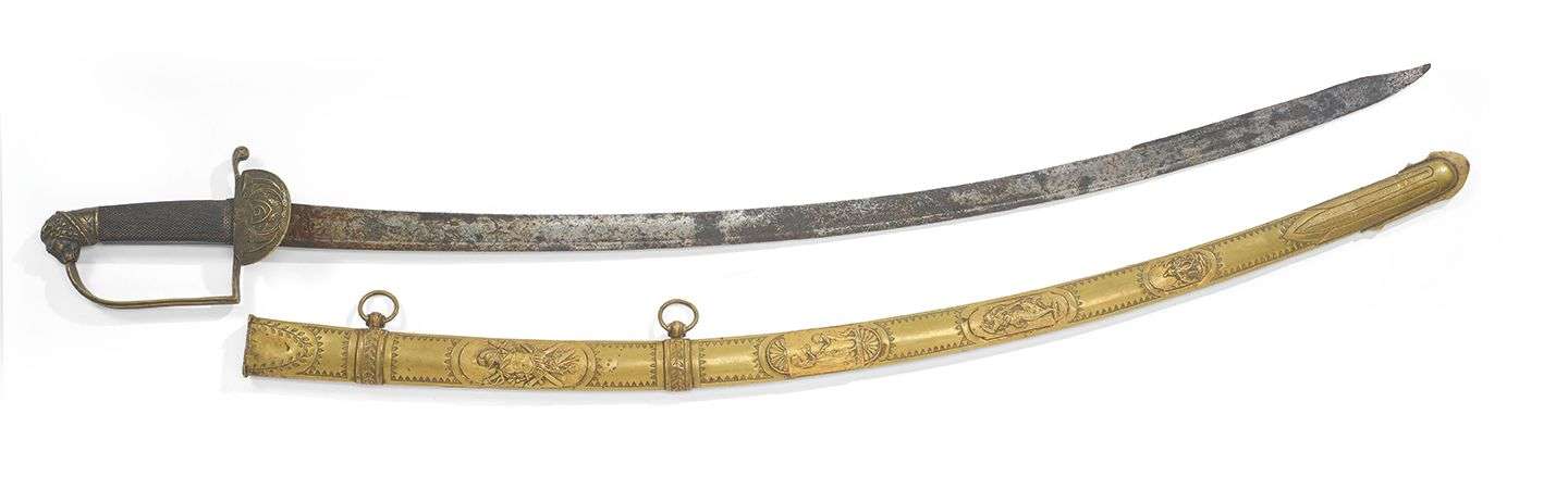 SABRE DU IXe CHASSEUR À CHEVAL Monture en laiton, infimes restes d'argenture et ébène. Calotte à tête de lion, arc de jointure décoré aux traits et quillon en forme de goutte. Clavier au chiffre 9 sur écu, fond d'aigle impériale et cor de chasse. Fusée en ébène quadrillé (fêle).