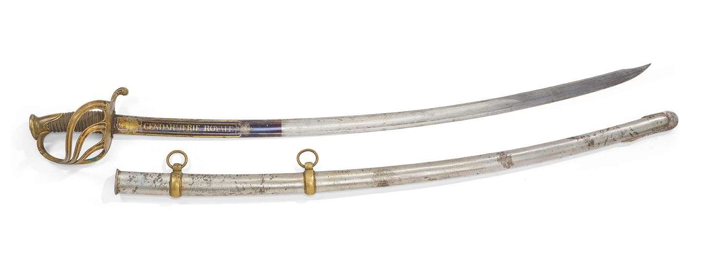 Coulaux frères courbe à pans creux et contre-tranchant. Elle est gravée, dorée et bleuie au tiers avec la mention « GENDARMERIE ROYALE » sous couronne.