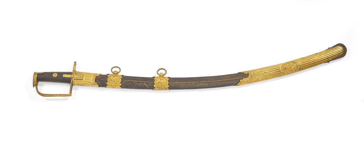 SABRE D'OFFICIER DU Ier RÉGIMENT DE HUSSARD, GARDE À L'ALLEMANDE Monture en laiton ciselé, doré et ébène.