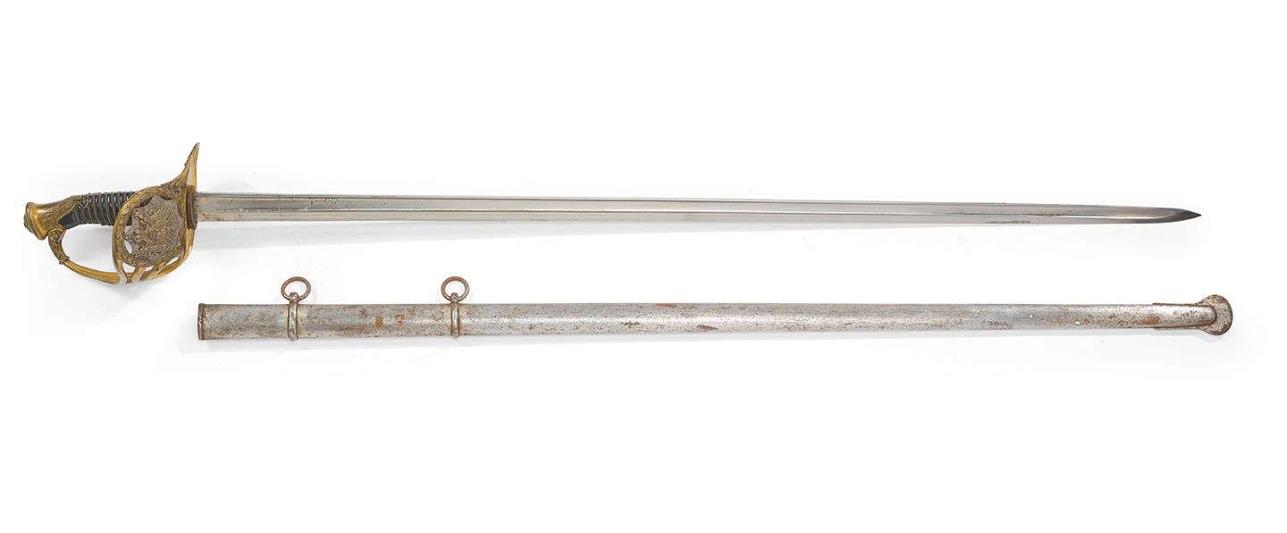 Arc de jointure dont se détachent trois branches rejoignant un médaillon aux grandes armes impériales. Queue de plateau à palmette. Fusée en corne filigranée. Lame droite, dos en T et gouttière sur toute la longueur signée au dos « Coulaux & Cie Klingentha ».