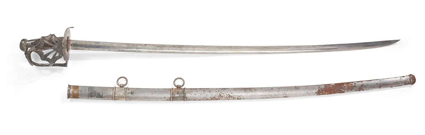 Pièce de garde en deux parties assemblées. Arc de jointure plat dont se détachent deux branches reliant la palmette ajourée formant la coquille. Plateau poinçonné au premier coq, grosse garantie et queue de plateau à palmette. Fusée en bois recouverte de cuir filigrané argent. Lame courbe à pans creux et gouttière poinçonnée par Mouton et Levavasseur.