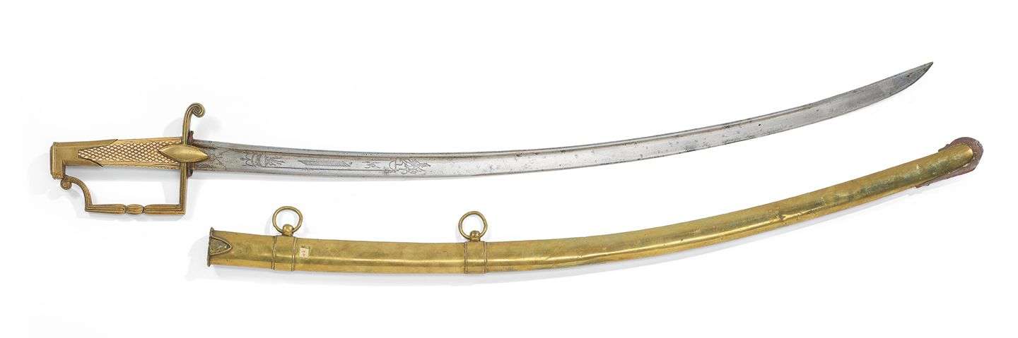 SABRE D'OFFICIER DE CAVALERIE LÉGÈRE Monture en laiton. Calotte type à l'allemande pans coupés, arc de jointure type colonne cannelée, croisière en amande et quillon à enroulement.