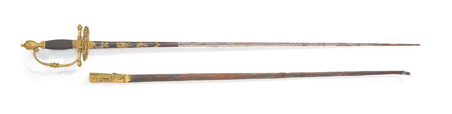 Napoléon 1er, tête laurée. Arc de jointure à cartouche au motif rayonnant, noeud de corps à la couronne, dont se détachent deux quillons droits. Clavier ajouré à l'aigle impériale serrant un bâton de foudre, ceint d'une couronne végétale. Contre-clavier à deux cornes d'abondance. Fusée en ébène quadrillé. Lame de Solingen, droite à section triangulaire, gravée, dorée et bleuie au tiers.