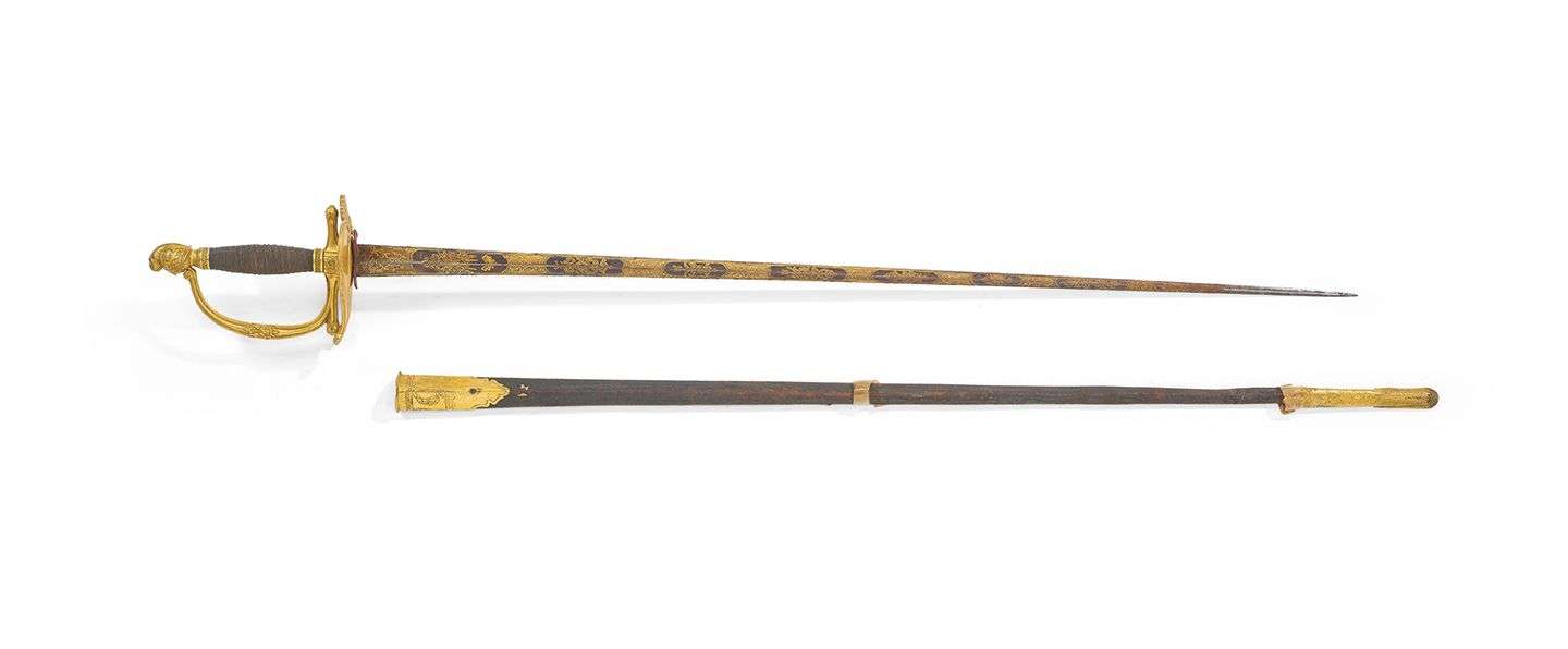 Coquille symétrique décorée aux traits, trophées d'armes et feuilles d'acanthe. Fusée bois recouverte d'un double filigrane alterné en argent. Lame droite à section triangulaire ciselée, dorée, et bleuie sur toute la longueur.