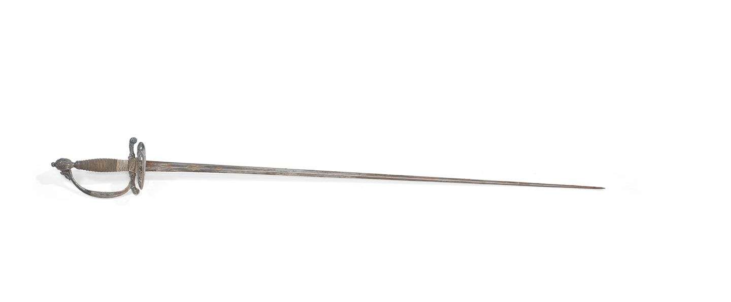 ÉPÉE DE COMMISSAIRE DES GUERRES AU RÈGLEMENT DE L'AN XII Pommeau à décor de pot couvert, arc de jointure plat à décor d'un cygne et épis de blé (poinçon au coq). Noeud de corps aux cornes d'abondance, dont se détachent deux quillons courbes. Clavier ajouré à motif de grappes de raisin. Fusée en bois recouverte d'un double filigrane alterné argent. Lame de Solingen droite à section triangulaire gravée tiers.